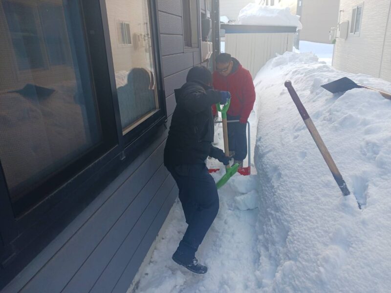 排雪部隊が到着するまでに急いで建物裏から雪を運びます。