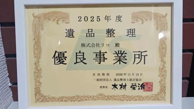2025年度 遺品整理優良事業所に認定証が届きました
